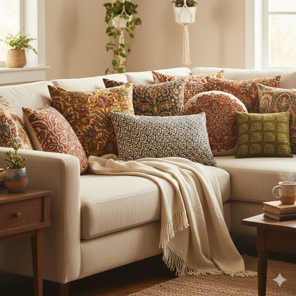 Bohemian decor is all about layering textures, embracing global influences, and creating a relaxed, lived-in feel. It’s a style that celebrates individuality and comfort, making it perfect for those long winter days spent indoors. And when you introduce hand block prints, you add a layer of artisanal charm, history, and a subtle touch of elegance that mass-produced items simply can’t replicate.