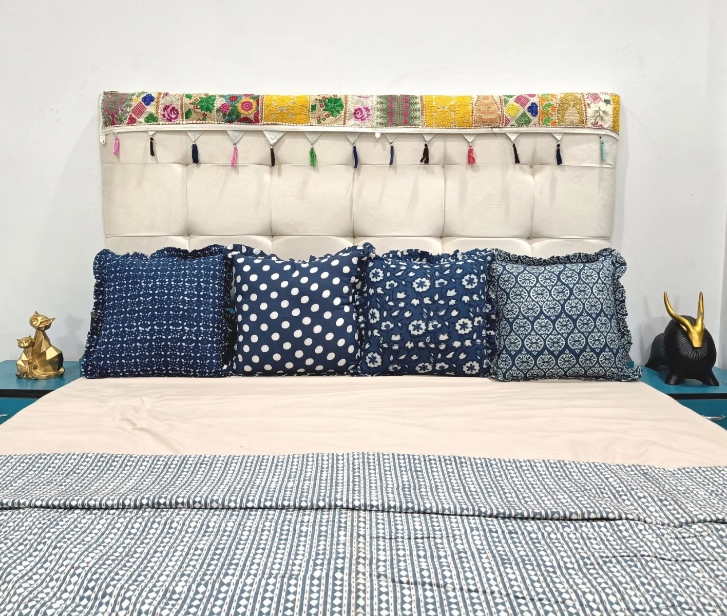 - Accent Pillows: Place two or three oversized block-printed cushions against your headboard. It adds height and a hotel-like luxury feel.