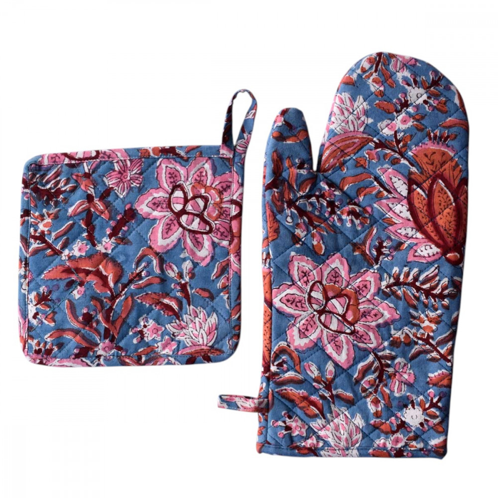 Hand block printed, hand-quilted cotton oven mitt and pot holder set, durable, heat resistant, and artisan crafted for elegant and practical kitchen use.